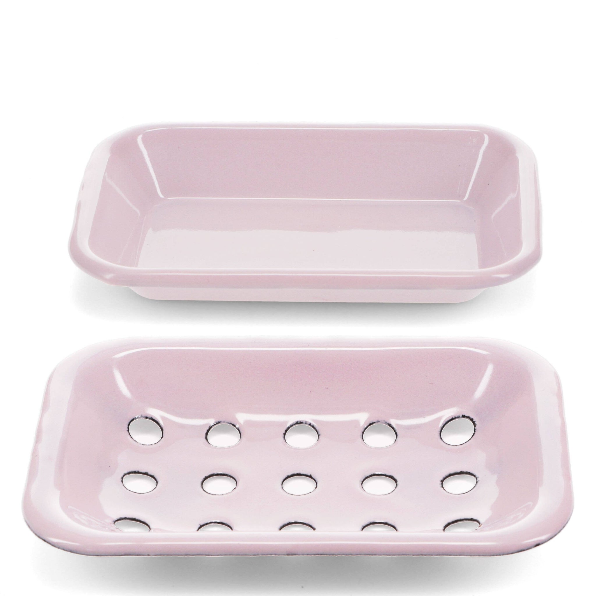 Retro style enamelled metal soap dish in pink, with distressed edging details in black.