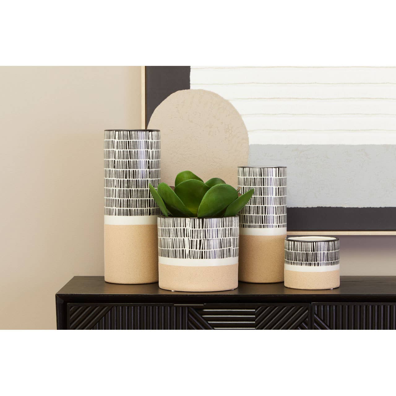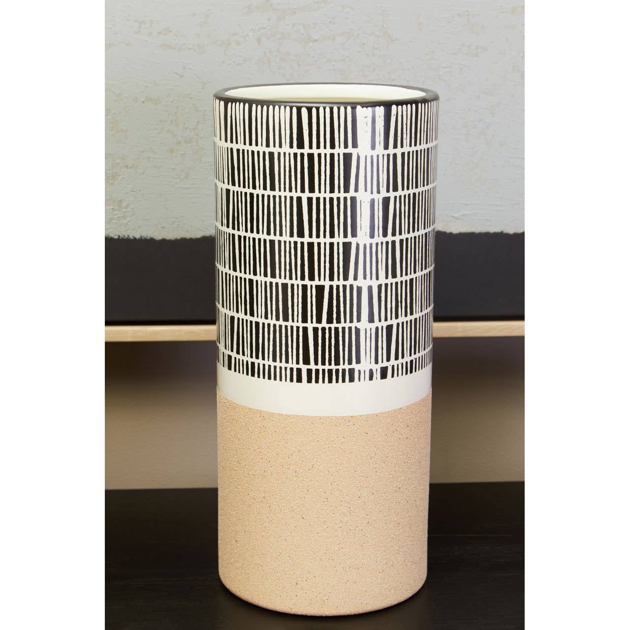 The simple form of this elegant small vase is elevated by a series of white stripes accentuated on the black surface.