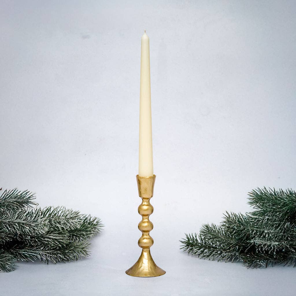 Hand Crafted Gold Metal candlestick featuring a bobbin style detail to its stem. It has a sturdy broad base, and is available in two sizes.