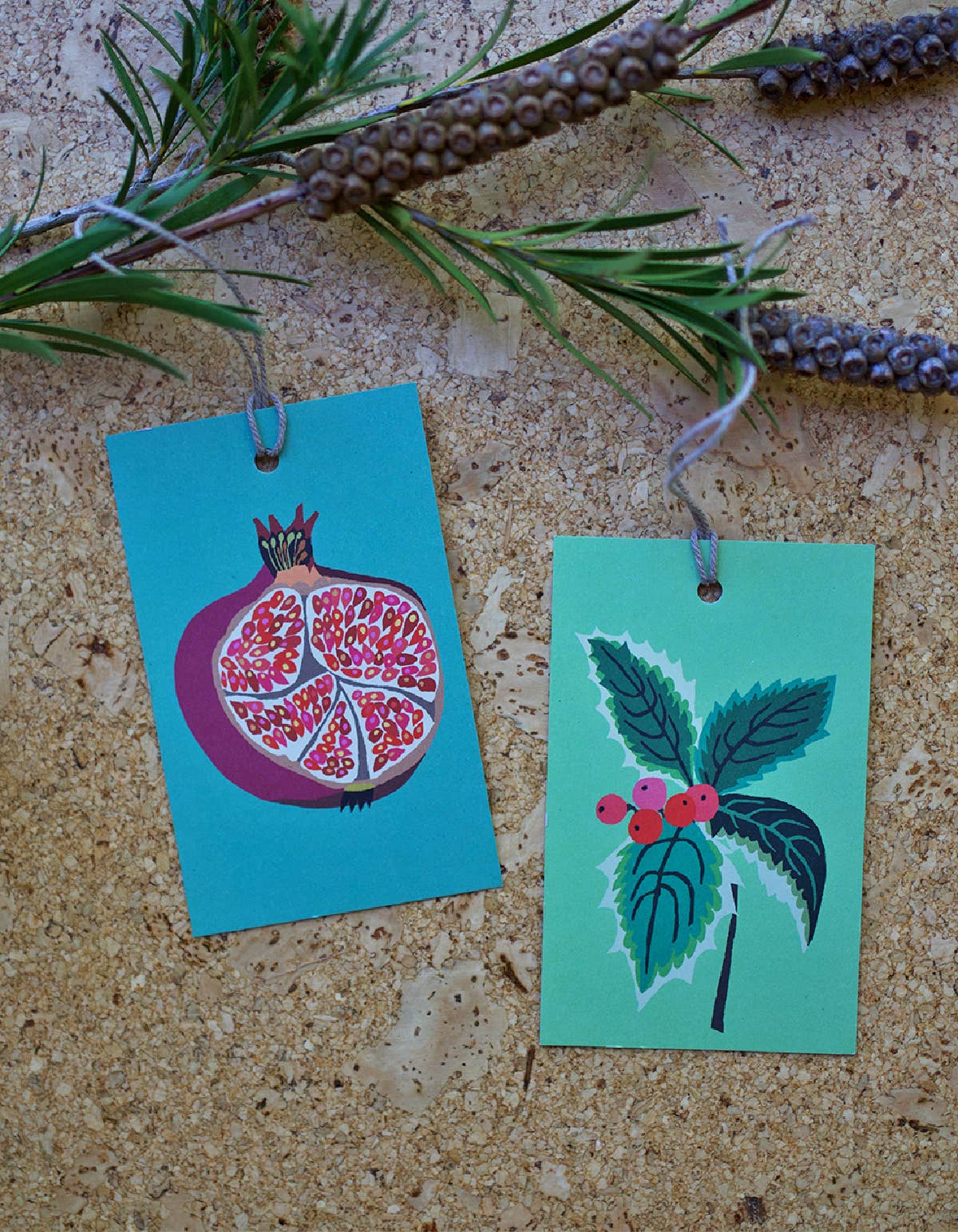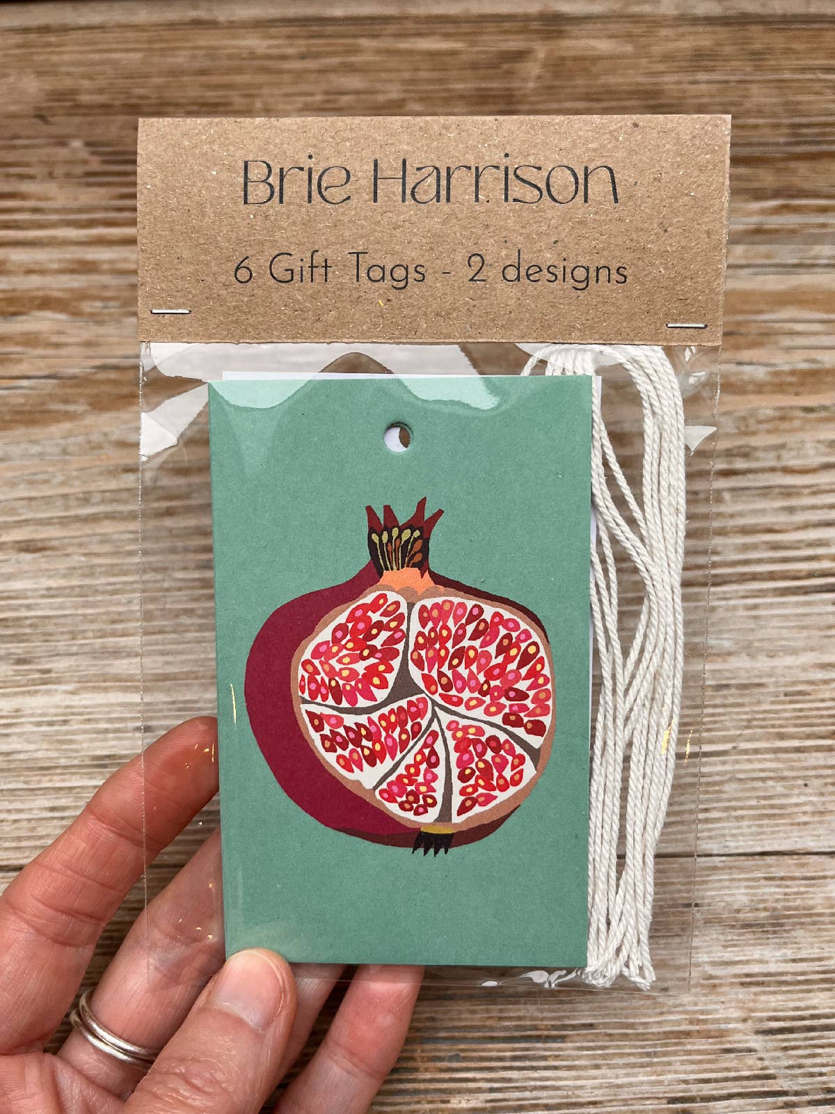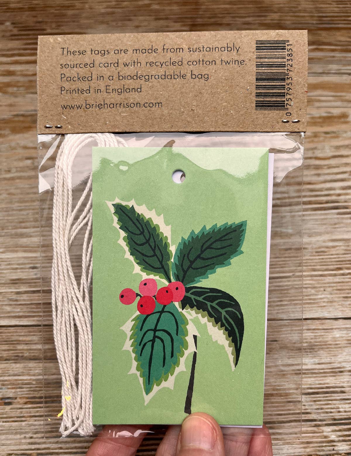 A pack of 6 gift tags. 2 designs - 3 of each. Blank on the reverse. Printed on a lovely sustainably sourced recycled 300 gsm card. With matching recycled cotton twine, loose & ready to thread. Dimensions : 10.5cm x 6.5cm to give plenty of room to write your message. Packed in a biodegradable bag with a descriptive kraft paper header. Printed locally to Brie's studio in Suffolk with a carbon balanced printer. These tags perfectly complement our December Gift Wrap.